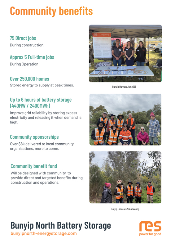 RES is committed to working with local stakeholders to ensure the Project creates lasting value for the Bunyip district. We are currently seeking community feedback to shape benefit-sharing opportunities that reflect local priorities. Contact us with your ideas.