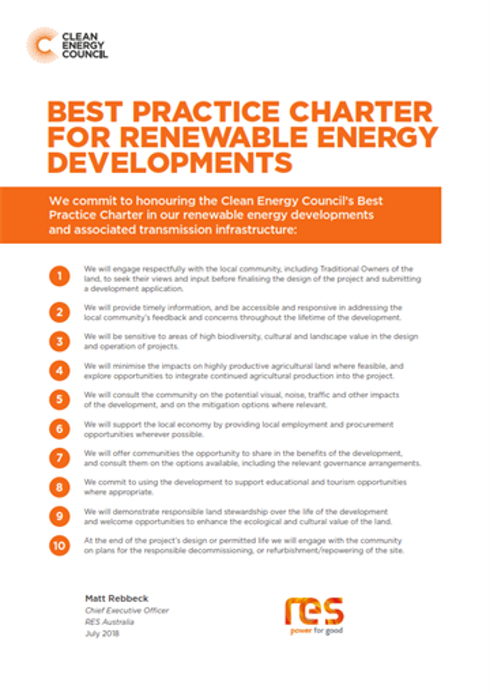 RES in Australia is delighted to be a founding signatory of the Clean Energy Council's Best Practice Charter for Renewable Energy Developments.